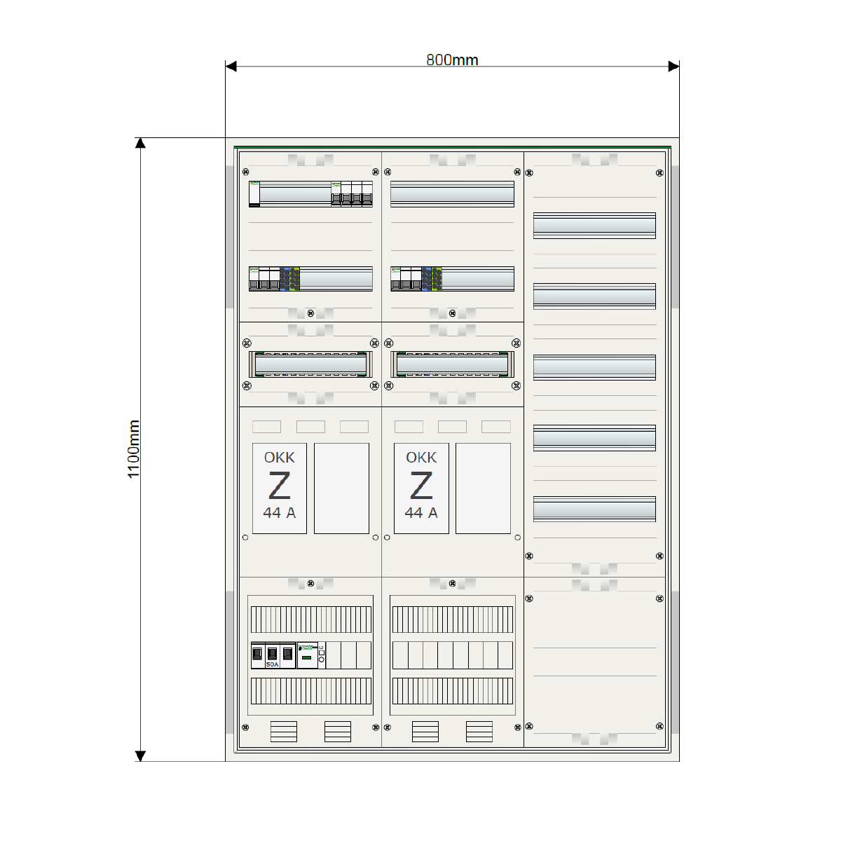 2 Zählerfeldern Kaskadiert verdrahtet mit Kuppelschalter für BKE-Steckzähler mit 16 mm² Verdrahtung für 44 A Dauerstrom und 3-poligen Hauptschalter, netzseitiger Anschlussraum mit SH-Schalter 3 polig 50 A, Einspeiseadapter für den Anschluss der Zuleitung an Federzugklemmen bis 25 mm², Überspannungsschutz Kombiableiter 7,5 kA T1 T2 T3 und Steuersicherung D02, Verteilerfeld mit 5 Reihen für 60 TE, PE und N -Steckklemmen und APZ-Raum, 2 Stück RJ45 Schnittstelle für APZ und RfZ, Koppelrelais A9A15393 für die Weitergabe des Steuersignal.