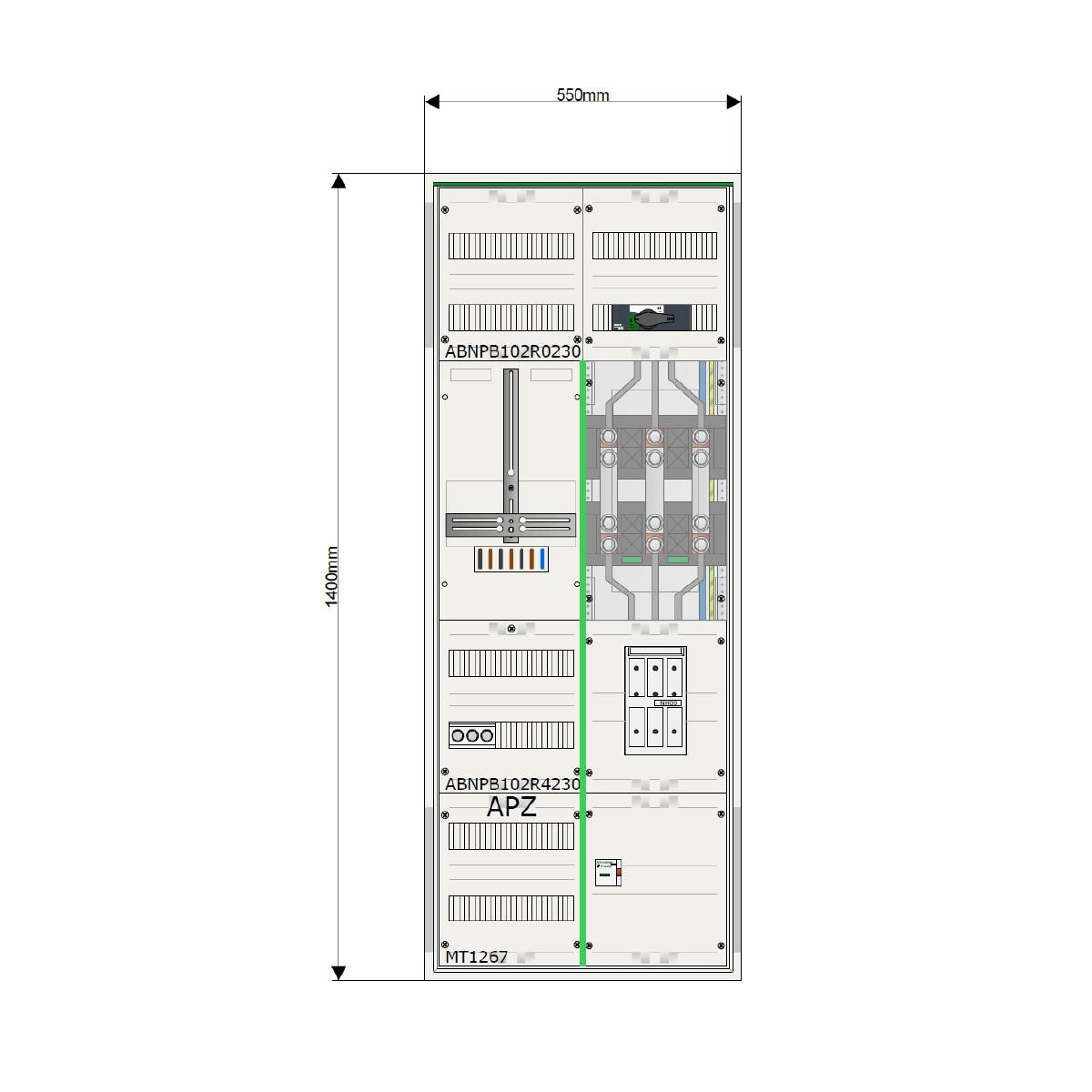 Zähleschrank Schutzisoliert IP44, 1x NAR mit 40 mm Sammelschiene 2x12x5 mm bestückt mit Überspannungsschutz 7,5 kA T1 T2 T3, NH00 Lasttrennschalter, 1x Wandlermodul 450 mm für Wandlerlaschen Bauform A mit 30 mm Breite, 1x AAR mit Lasttrennschalter 3-polig 125 A und Klemme für N und PE, 1x Wandlerzusatzraum 300 mm 24 TE bestückt mit Spannungspfadsicherungen und Wandler-Trennklemmen, 1x 3-Punkt Zählerplatz 450 mm, 1x APZ-Raum 300 mm mit RJ45 Schnittstelle